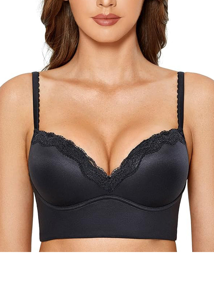 Pull over style wirefree booster. Push up bralette with lace detail, adjustable straps and wide elastic underbust band.