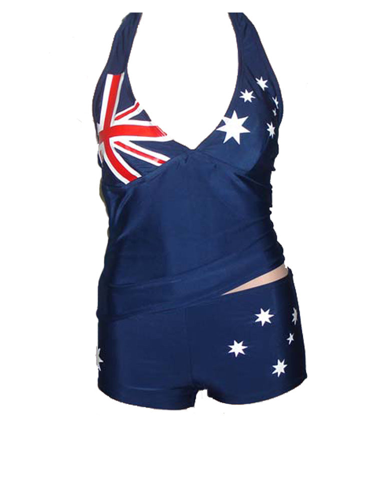 Fun Aussie flag, halter tankini has tie neck, pads for smoother look and modesty.