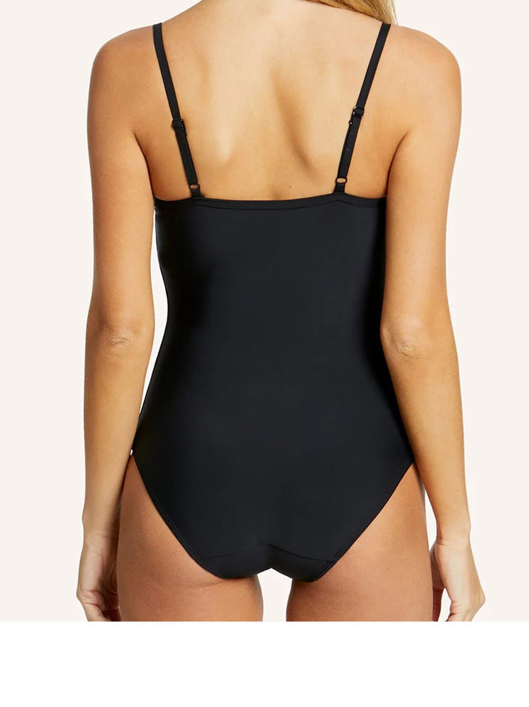 wash and wear, flattering one piece design with adjustable straps. 4 way stretch fabric. Medium bottom coverage, built in shelf bra with removable pads.