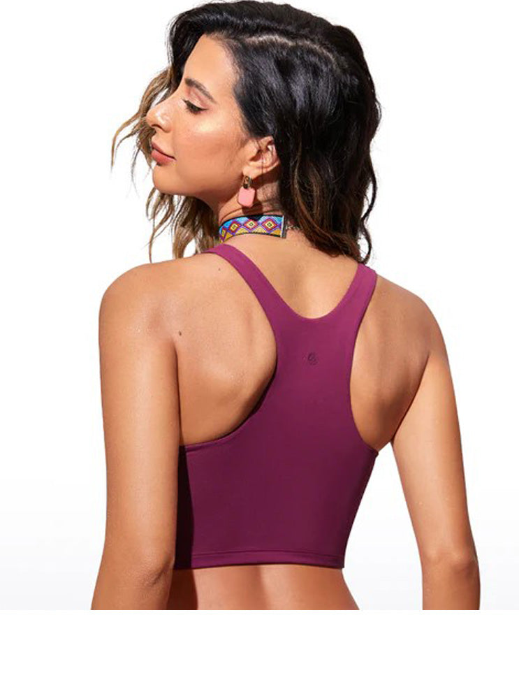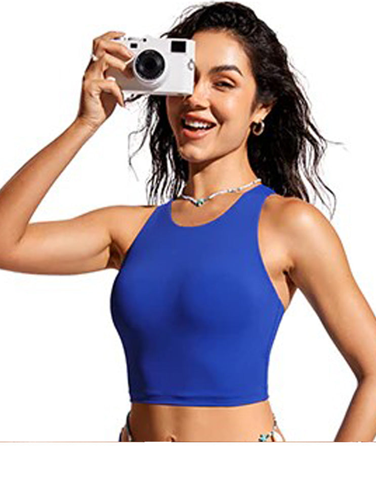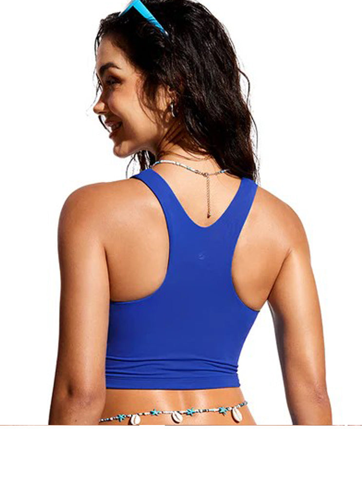 Sunshine womens bikini top, fabric smooth and quick drying, built in cups with racer back design. Breathable 4-way stretch. Beach, Yoga, Relaxing.