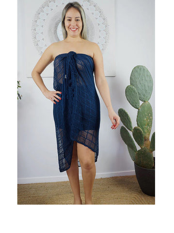 100% cotton mesh, a great cover up, beach, pool or lake. Light fringed mesh. Sarongs can be tied around his waist over the bust or around neck.