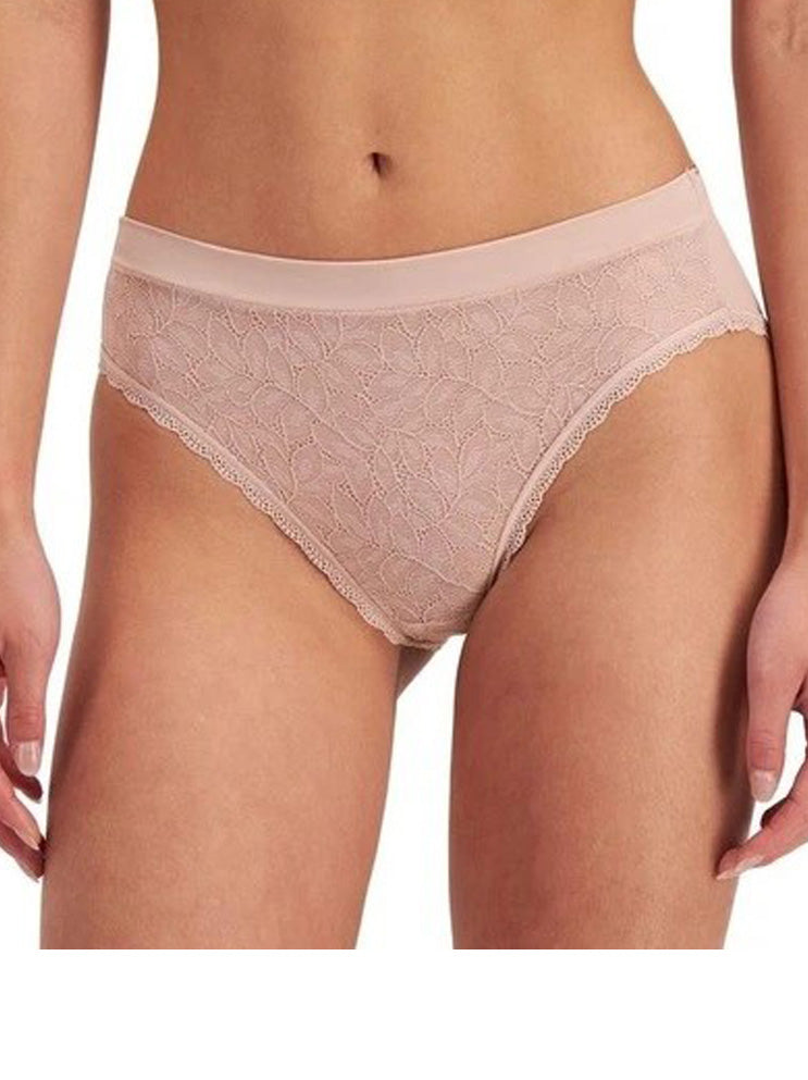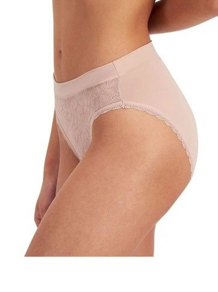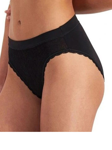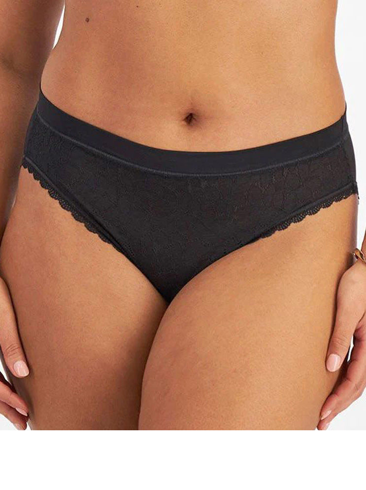 Soft stretch lace front bikini with a wide dig free waistband for comfort, with fuller coverage, cotton gusset and pretty lace edging.