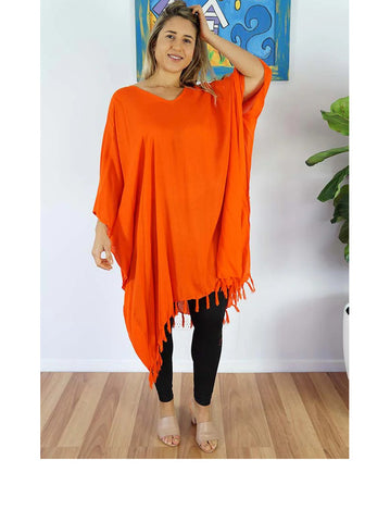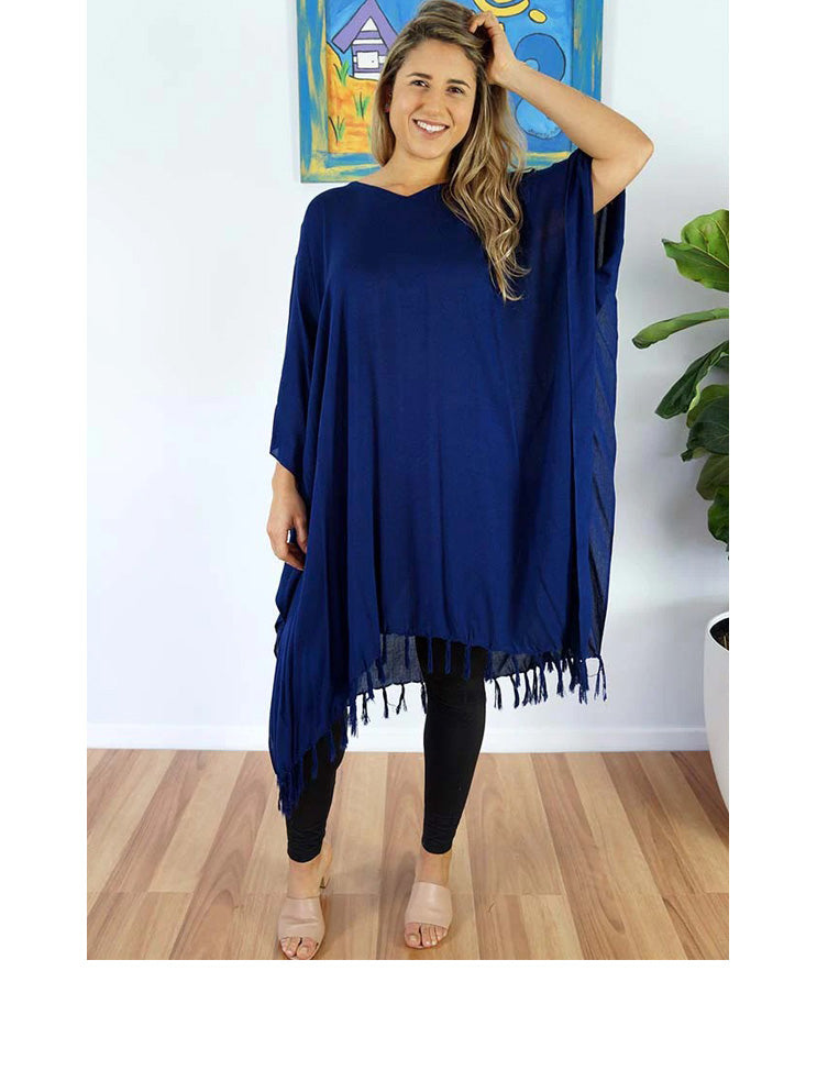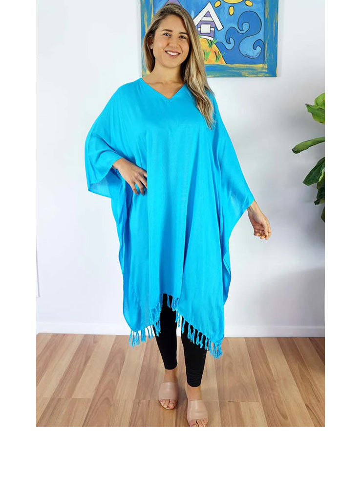 100% Rayon V Neck cover up with tasseled hem. A loose, comfortable way of relaxing at the pool or beach. Over swimwear or with leggings. Overall width 96cm, length 91cm.